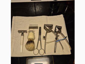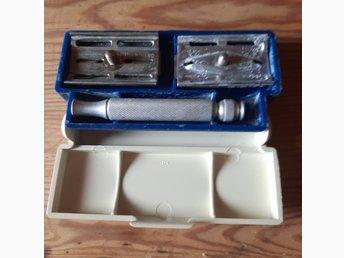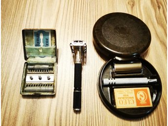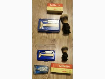 Rakset med tillbehör rakhyvel säkerhetshyvel sax trimmer Gillette vintage