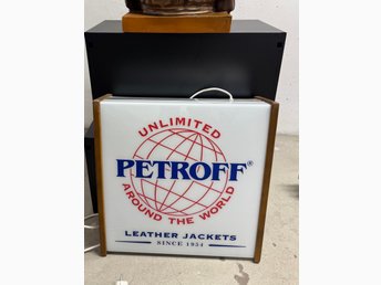 Vintage belyst butiksskylt – Petroff Leather Jackets – 80/90-tal