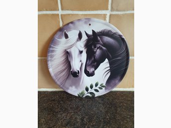 Dekorativ rund plåtbricka med hästmotiv