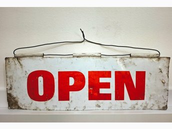 Retro skylt plåt open closed med patina 14x42 cm - från engelsk bensinmack urbex