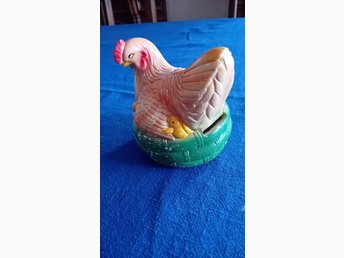 Äldre sparbössa till Påsk? höna med kycklingar, ca 12½ cm hög, 12 cm bred