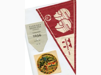Hedemora TT __ Motorcykel Tävlingar __ 2 Vimplar Entrébiljet 1956 Klistermärke