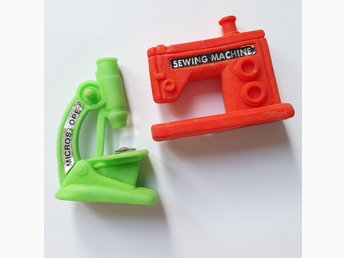 Suddgummi symaskin och mikroskop, vintage, retro 80-talet, suddisar, nostalgi