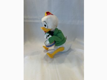 Vintage trumspelande anka – uppvridbar plåt- och plyschleksak