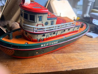 Vintage "Neptune" bogserbåt i plåt från Modern Toys, Japan