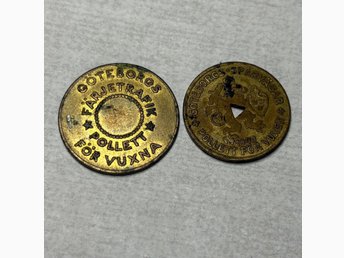 Två äldre spårvagnspolletter – Göteborgs Spårvägar / Färjetrafik