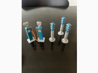 Modellbensinpumpar och trafikljus i metall för modelljärnväg m.m