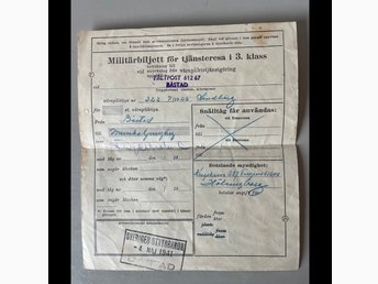 Militärbiljett för tjänsteresa 3:e klass. 1941. Båstad-Munka Ljungby.