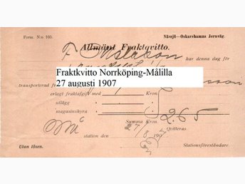 Allmänt Fraktqvitto Nässjö-Oskarshamns Järnväg 27 augusti 1907 Norrköping-Målill