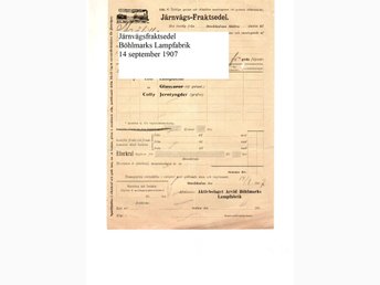 Järnvägsfraktsedel från AB Arvid Böhlmarks Lampfabrik till Målilla 14 sept 1907