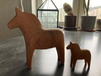 Dalahäst i trä, 2-pack natur färg två stycken vintage antik