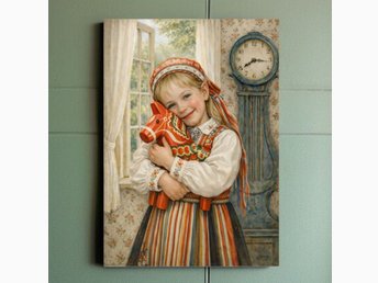 Hård tavla - flicka med dalahäst från Dalarna, allmoge