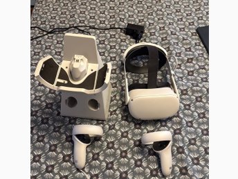 Meta Quest 2 VR-headset med handkontroller och laddningsstation