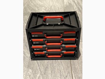 Förvaringslåda med fyra utdragbara lådor i mycket b ra skick !