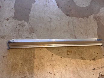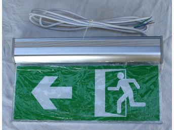 Nödutgång, takskylt med belysning och upphängningsöglor. Oanvänd