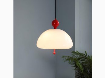 Stor Medieval Retro Taklampa – Krämfärgat Glas & Röda Detaljer, Ø40 cm