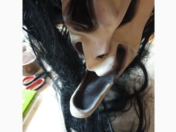 Häxmask med peruk, klassisk halloween mask.