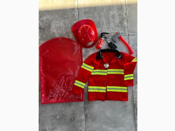 Brandman utklädningskläder och leksaksbrandbil