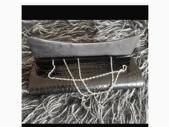 Helt oanvänd blank clutchväska med krokodilmönster och en repkedja som axelrem