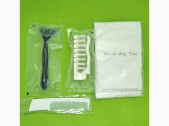 Resekit AirBnB-produkter 4: borste, kam, tvättlapp, rakhyvel