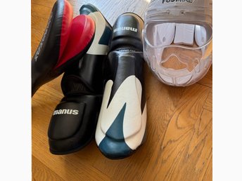 Kampsportsutrustning: Hjälm, benskydd, och sparkkudde