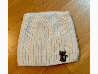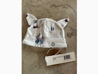 Vit barnmössa i storlek 92-104 med en kattdekoration