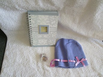 Fint set med söt barnmössa i lila och dagbok med plats för fotografi samt kedja