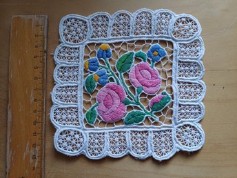 Duk i vitt med spetskant & broderi blommor i brunt rött rosa & grönt