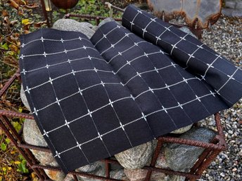 Djupsvart bordslöpare med dekorativt vävt mönster i oblekt och linnefärg