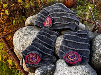 Härlig Mössa & handledsvärmare/torgvantar i sammet med virkade blommor