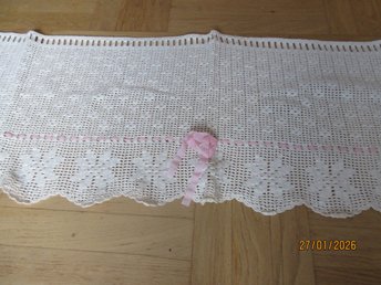 Handvirkad virkad gardinkappa gardin med rosa band 45x170 cm.