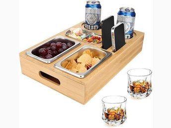 Serveringsbricka i bambu, med snacksskålar av rostfritt stål