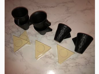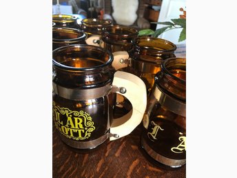 ölmuggar 8 st bruna med trähandtag ,med text ,NYA
