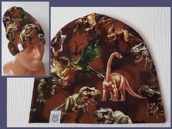 Mössa ca 3-10 år i DUBBEL trikå, nysydd, dinosaurier
