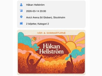 Håkan Hellström- 2 biljetter - 13 mars Stockholm Avicii Globen 2-4 biljetter