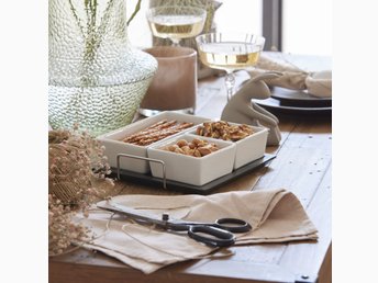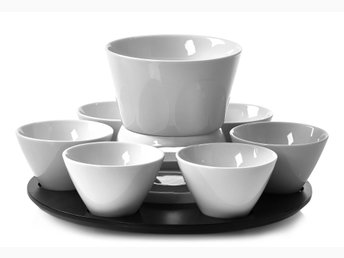 Praktiskt serveringsset i vitt porslin med bricka i svart trä med handtag