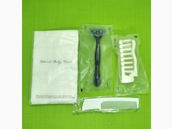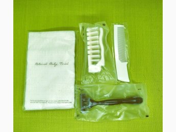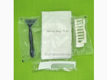 Resekit AirBnB-produkter 1: borste, kam, tvättlapp, rakhyvel