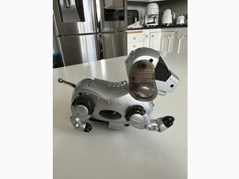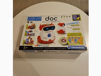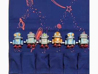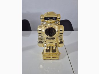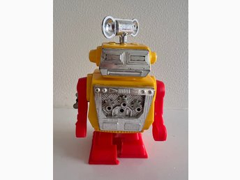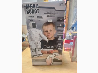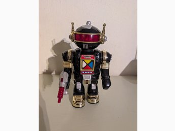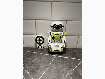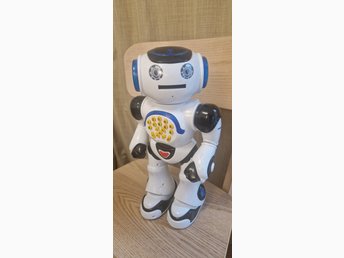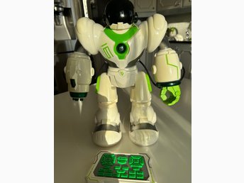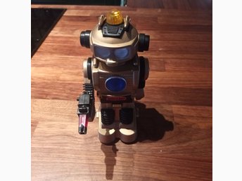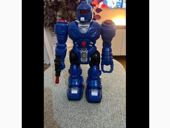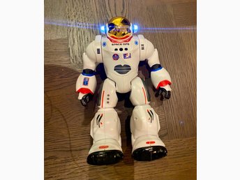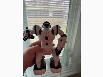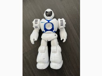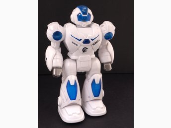 Leksaksrobot, 20 cm hög, vit med svarta och blå detaljer