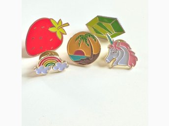 Set of 5 enamel pins, strawberry, crystal, palm tree sunset, unicorn, rainbow