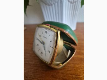 VINTAGE RESEVÄCKARKLOCKA "EUROPA" 4-KANTIG URTAVLA SKOGSGRÖNT LÄDERFODRAL