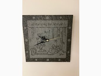 Väggklocka Hälge i sten med "Väck mig när du är klar"-motiv