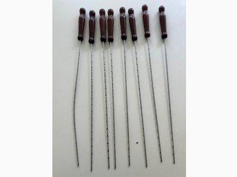 Set med 6 grillspett i rostfritt stål med trähandtag. Oanvänt.