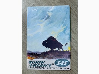 SAS reklam för flyg till USA - Retro - Plåtskylt - Ny 30x20 cm