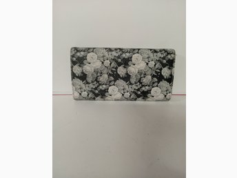 Plånbok med vita rosor och svart bakgrund.