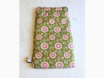 Glasögonfodral i mönstrat Tilda tyg grön med mönster i rosa, vitt, blått
