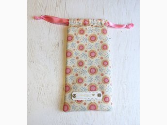 Glasögonfodral i mönstrat Tilda tyg beige med mönster i rosa, senapsgult, grönt