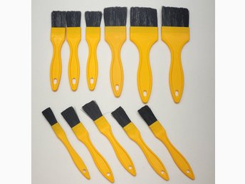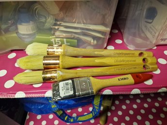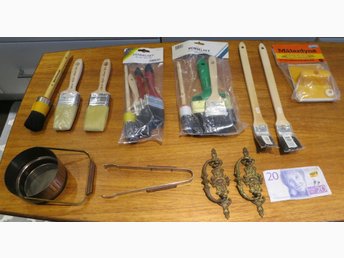 Säljes: 13+1 oanvända målarpenslar, 2 skåpsbeslag, 1 oliv-serverings-kanna (?)