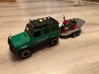 Leksaksbil med släp och motorcykel