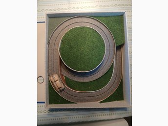Lilla Faller AMS-bana i en A4-pärm (21 x 29,7 cm) med en beige VW 1200