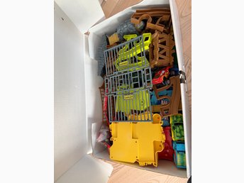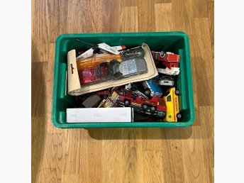 Leksaksbilar och andra leksaker i en grön låda